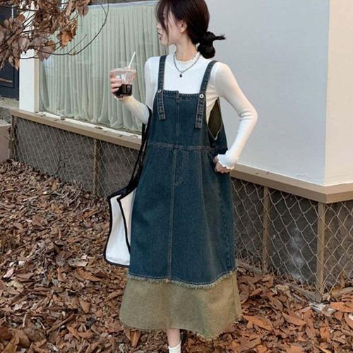[셀럽하우스]데님 DJDZ7313 빈티지 캐주얼 배색 멜빵 원피스