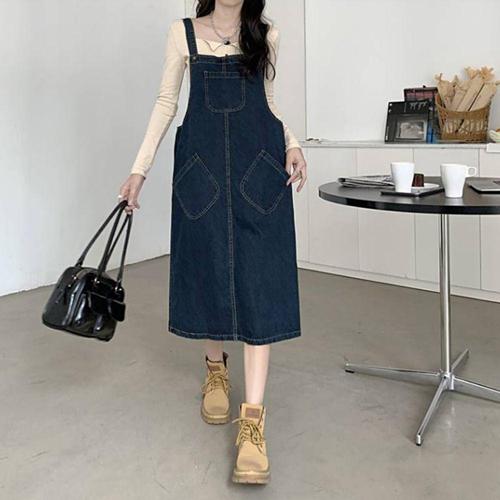 [엄지척]여성 캐주얼 귀여운 포켓 멜빵 청치마 데님 롱원피스_19951752_667501