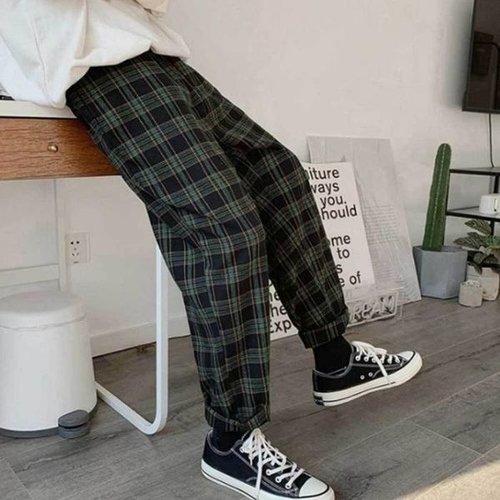 [셀러허브_여성트랜드패션]츄리닝 체크무늬 면 롤업 통 오버핏 밴딩 긴바지 슬랙스 면팬츠