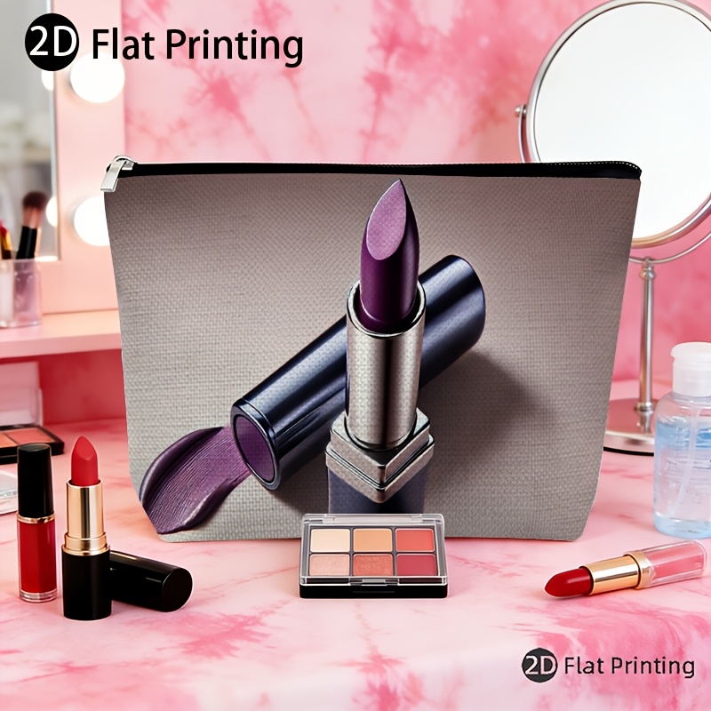 TEMU 아름다운 보라색 립스틱 디자인의 휴대용 린넨 메이크업 가방, 재사용 가능, 여성용 세면용품에 적합, 지퍼가 달린 필수 야외 수납 파우치, 여성용 맞춤형 메이크업 가방, 생일, 크리스마스 선물로 이상적