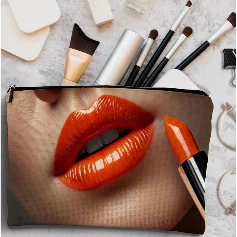 TEMU 1개 2D 평면 프린팅, 립스틱 프린트가 있는 화장품 파우치, 밝은 오렌지 립스틱 패턴, 휴대용 화장품 가방, 재사용 가능, 여성용 화장품 파우치, 지퍼가 있는 야외 필수 보관 가방, 2D 평면