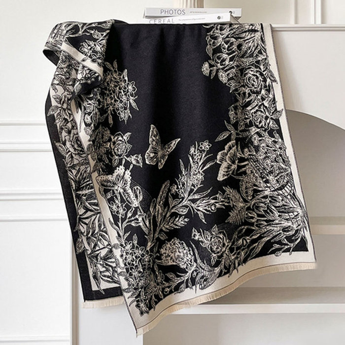 TEMU 편안한 양면 고양이 자수 스카프 - 부드러운 폴리에스터, 블랙 & 크림 동물 패턴 프린지, 겨울 외출용 따뜻하고 스타일리시