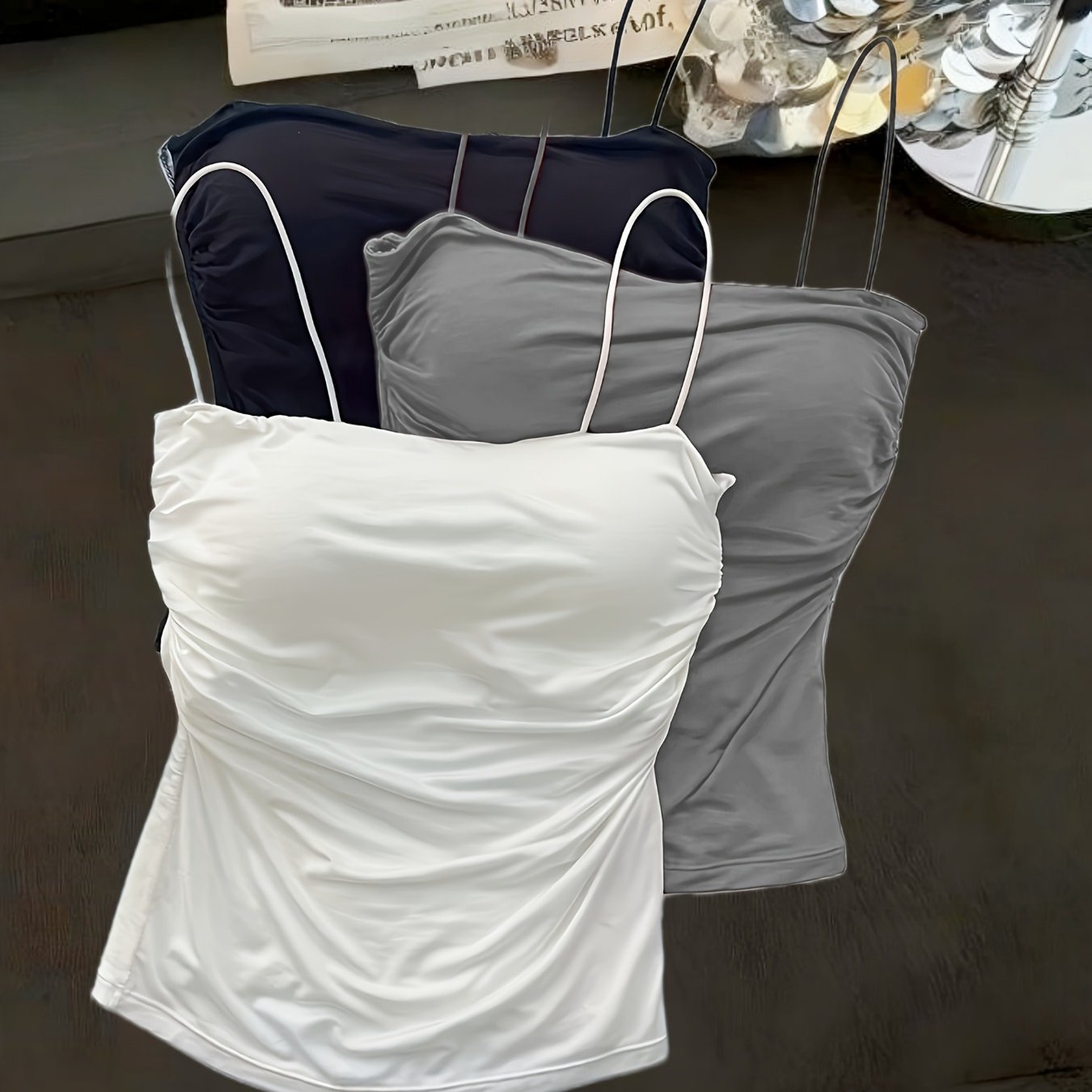 TEMU 여성용 민소매 탑 3pcs - 우아한 캐주얼 넥 블라우스, 허리 주름 디테일, 로우넥 스트랩 루즈 스모크 셔츠, 사계절 착용 가능 (손세탁)