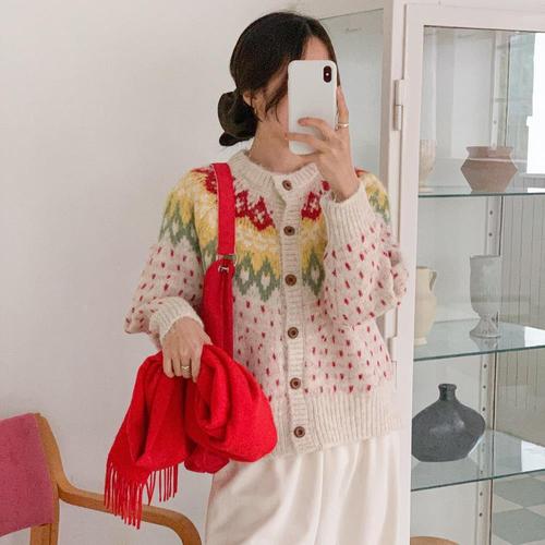 [신상오픈런]여성 무지개 색상 라운드넥 도트 부클 니트 카디건