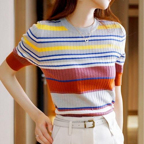 [셀럽하우스]여자 XENM0023 여름 반팔니트 무지개 티셔츠 니트티 여성
