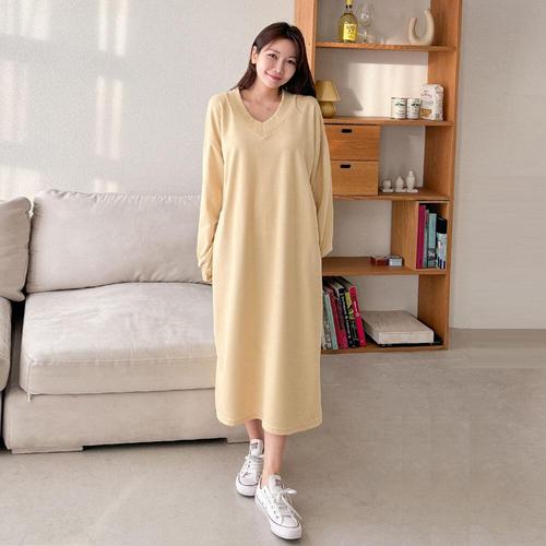 [유야]편한 면 무지 브이넥 긴팔 포켓 롱 원피스 홈웨어 꾸안꾸 -OP0257H- 빅사이즈 루즈핏 여성 가을