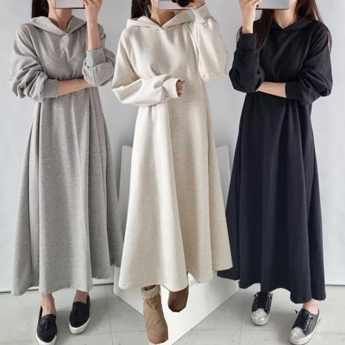 [유야]캐주얼 면 무지 후드 긴팔 플레어 롱 원피스 -OP0411H- 빅사이즈 루즈핏 여성 가을