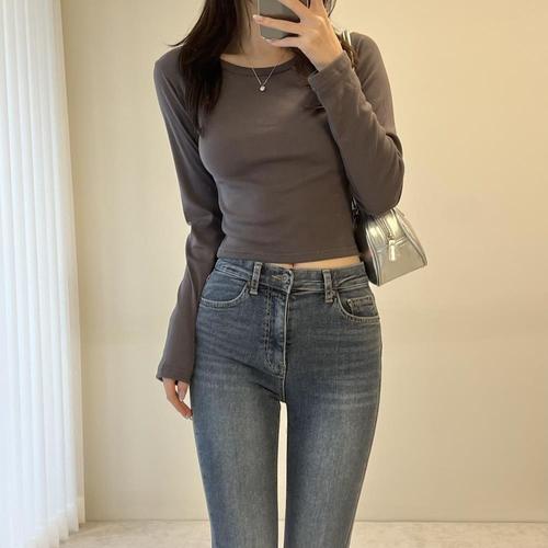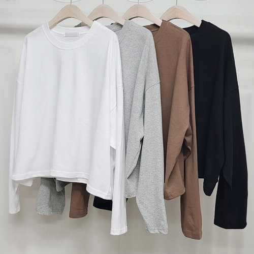[옷자락] 여자 가을 크롭 기본긴팔 라운드넥 코튼 무지 티셔츠