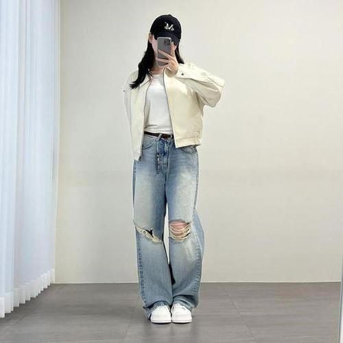 [옷자락]여자 연청 와이드핏 워싱 찢청 무파진 구제 청바지