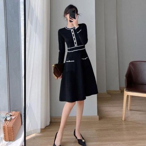 [셀럽하우스]데이트룩 NSIE0174 패턴 하객룩 니트 미디 배색 와플 미니원피
