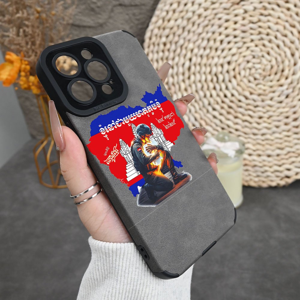 TEMU 캄보디아 지도 및 병사 이미지가 돋보이는 고급스러운 인조 가죽 휴대폰 케이스. 충격 방지 및 내마모성 설계, 외관이 매력적이며 남녀 모두에게 적합하며 아이폰 17 및 기타 기종과 호환됩니다.