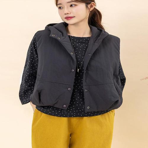 벅시루 여성 고깔 나일론 포켓 봄가을 여성 미시룩 레이어드 숏 후드 단추 조끼