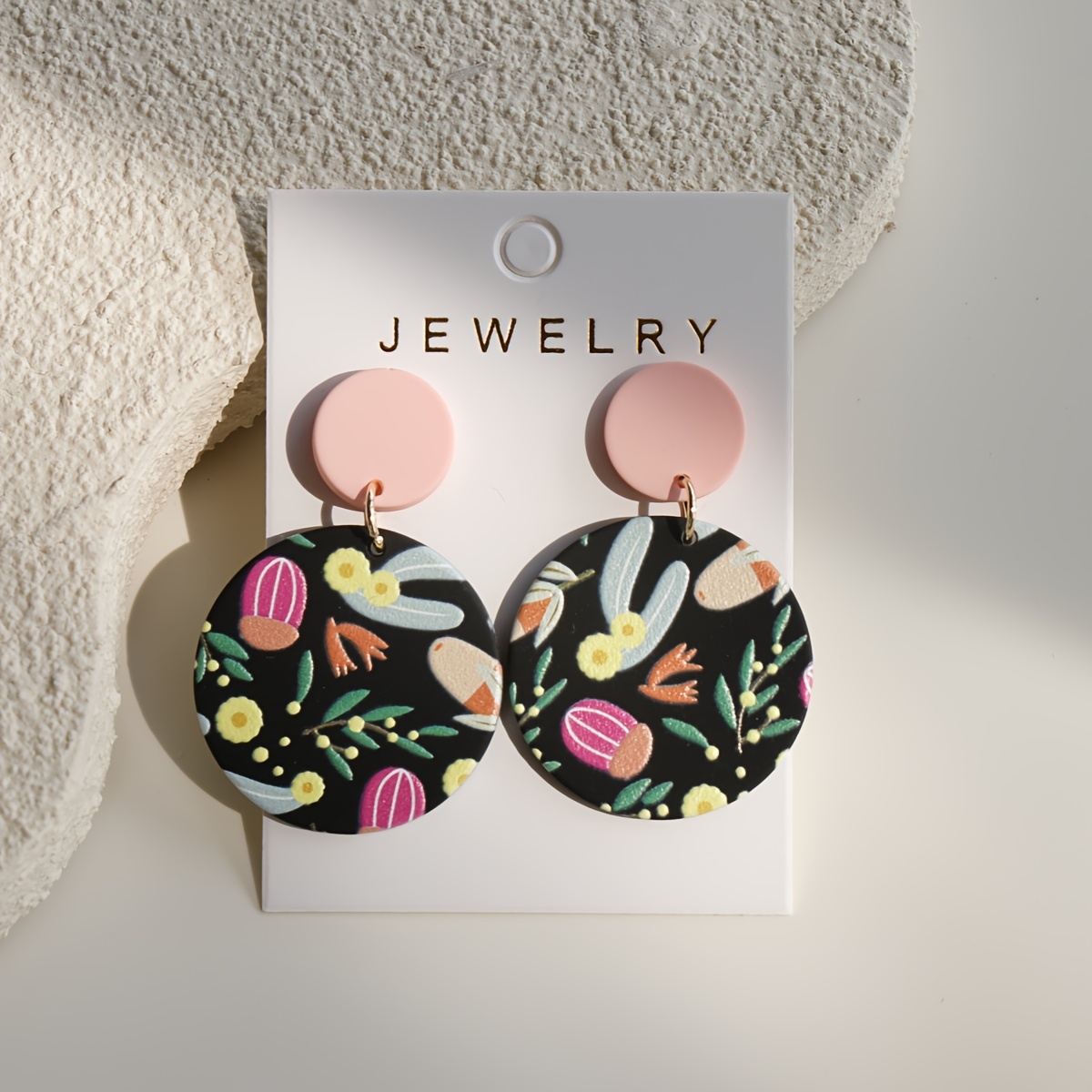 TEMU 여성을 위한 드롭 이어링 한 쌍. 블랙 앤 핑크 트로피컬 플랜트 프린트 아크릴 소재, 부드러운 세라믹 질감, 빈티지 엘레강스 스타일. Y2K 스타일로 일상복으로 착용하거나 축제 선물로 완벽합니다.