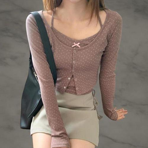 [옷자락] 여성 리본 골지 플라워 패턴 나시 크롭 유넥 가디건 세트