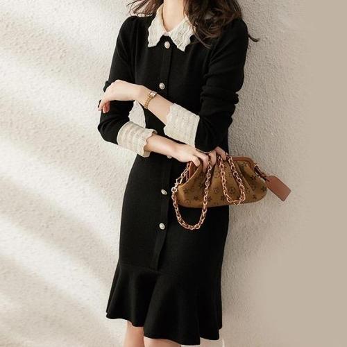 [엄지척]카라 소매 레이스 니트원피스 블랙 밑단프릴 슬림핏_19870048_667501
