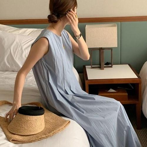[옷자락]여성 바스락 라운드넥 민소매 플레어 롱 원피스