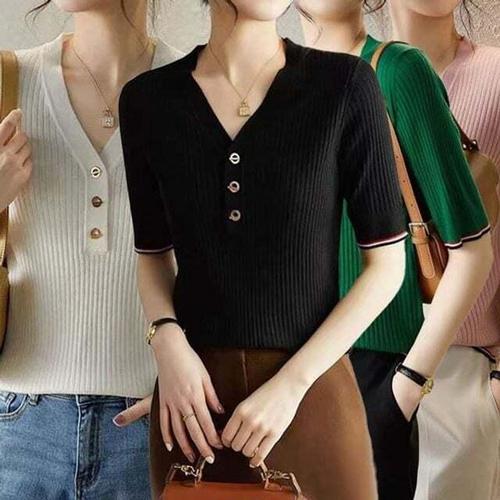 [셀럽하우스]여성 AIMA2194 여름 골지 브이넥 반팔 니트 티셔츠