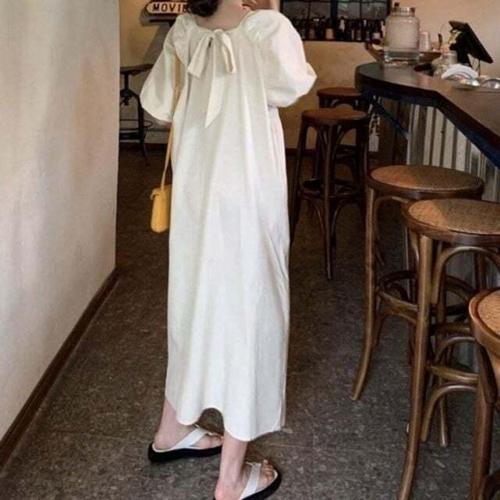 [셀럽하우스]U넥 RCOH4825 롱원피스 여름원피스 뒷리본포인트 바캉스룩 퍼프