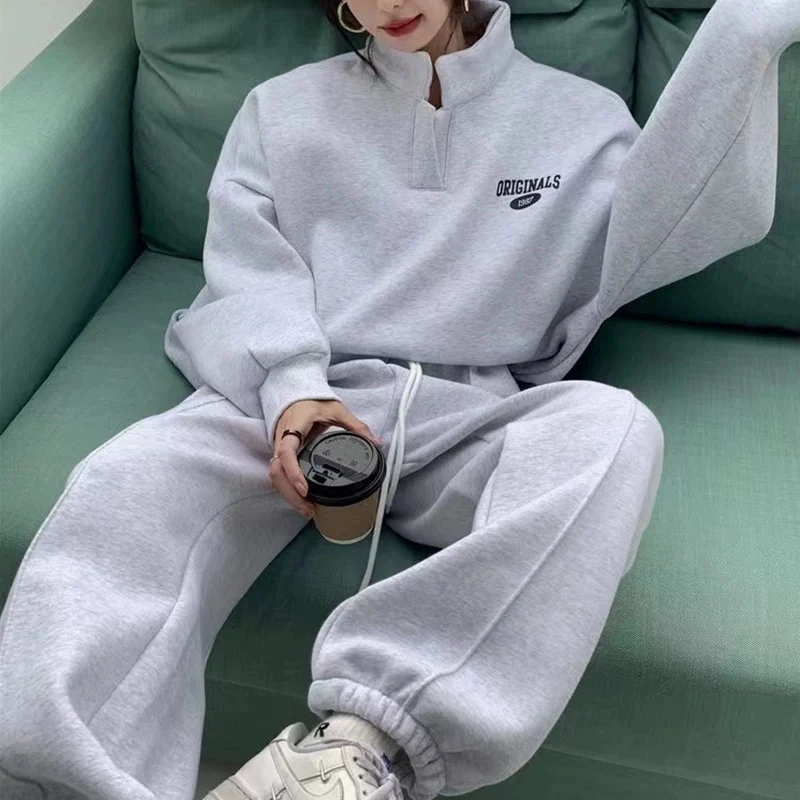여성용 스포츠 플리스 안감 두꺼운 스웨트셔츠 세트 캐주얼 스타일 투피스 트렌디 의상 면 긴팔 후드티