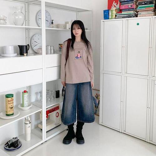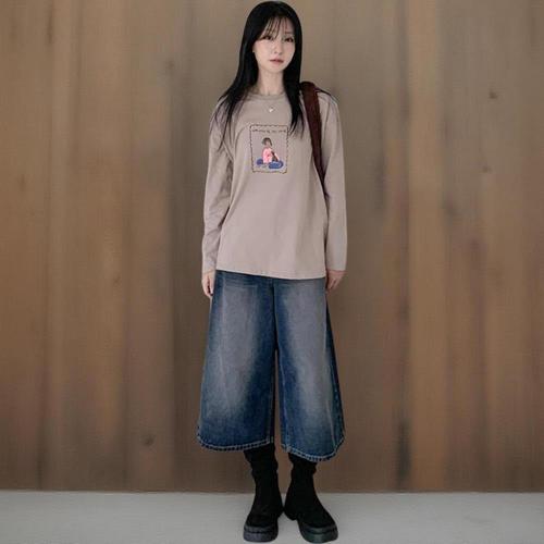 [옷자락] 여성 캐주얼 프린트 박스핏 라운드넥 긴팔 티셔츠