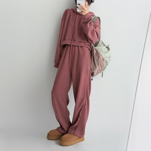 [옷자락] 여자 크롭 박스 골지 후드티 밴딩 일자핏 바지 세트