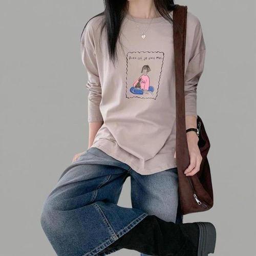 [옷자락]여성 캐주얼 프린트 박스핏 라운드넥 긴팔 티셔츠