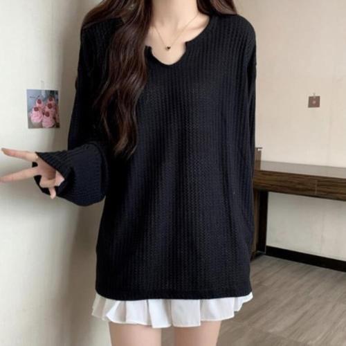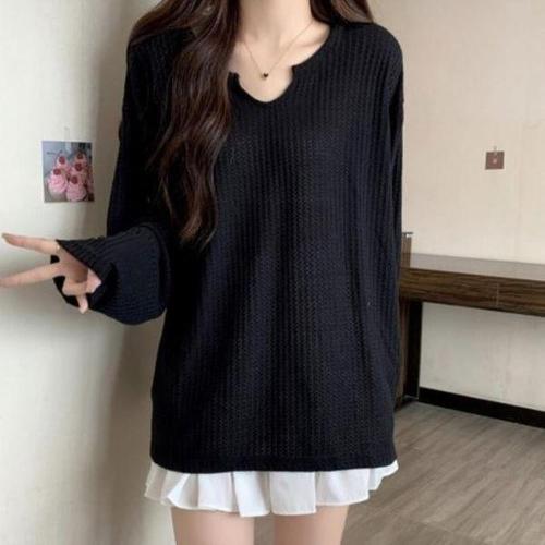 [신상오픈런]여성 단색 짜임 박스핏 앞트임 긴팔 티셔츠