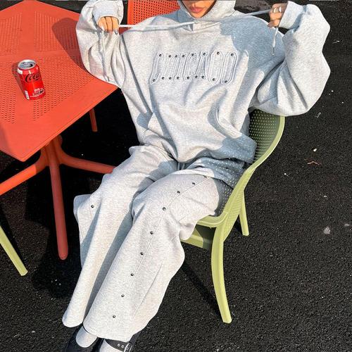 [미라클세븐]여성 후드티와 리벳 팬츠 세트, 박시 레터링 디자인