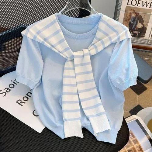 [셀러허브_여성트랜드패션]ONM 숄 여성 스트라이프 여름 반팔 니트 세트