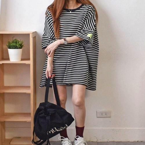 의류 스트라이프 캐주얼룩 룩 데이트룩 반팔 롱 WFLQAWN