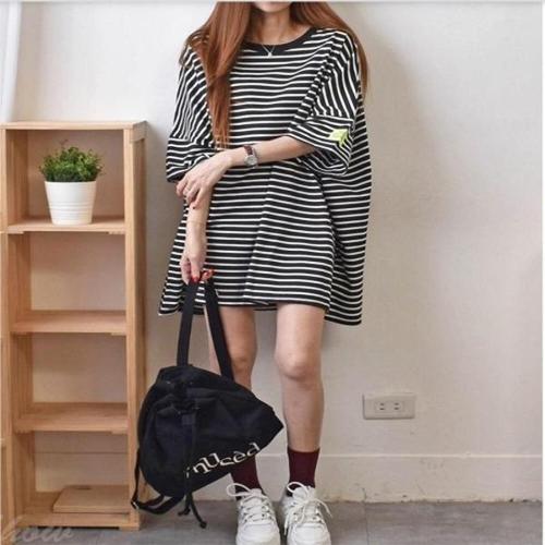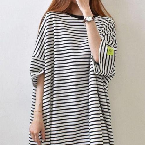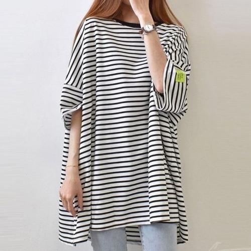 [엄지척]여성 편하고 캐주얼한 스트라이프패턴 반팔 롱티셔츠_19630467_667501