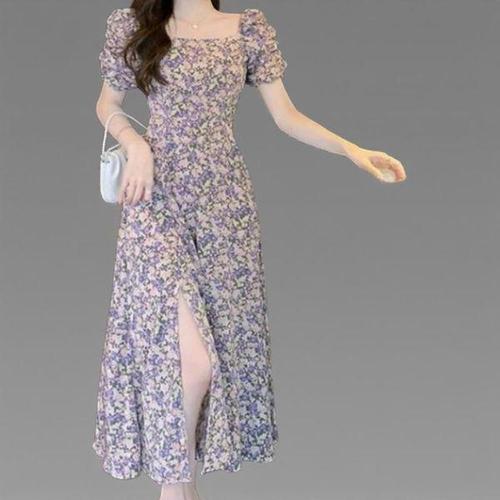 [신상오픈런]여성용 사랑스러운 플로럴 벌룬 소매 트임 반팔 롱 드레스