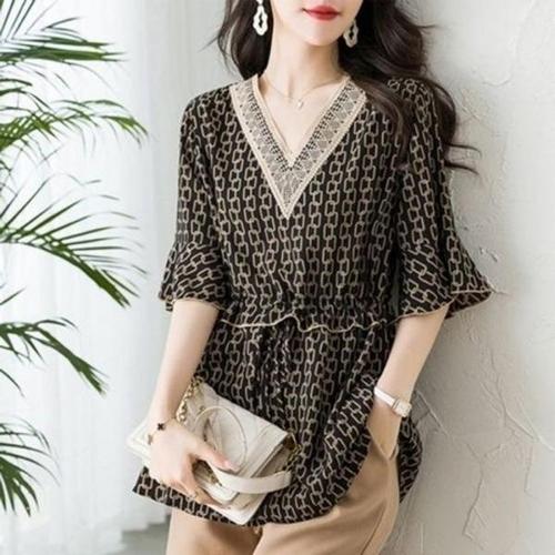 [엄지척]반팔 롱 패턴 V넥레이스 쉬폰반팔블라우스 시폰반팔블_19660766_667501
