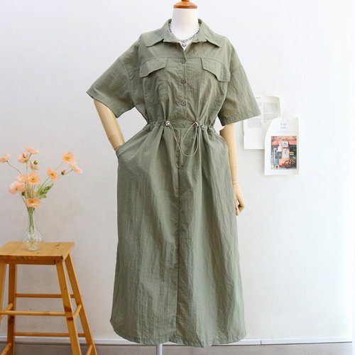[옷자락] 여성용 심플 허리 스트링 카라 반팔 롱 셔츠 원피스