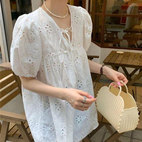 [에이치플러스몰]여성 레이스 펀칭 반팔 블라우스 E47