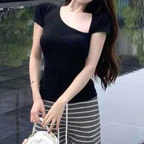 [에이치플러스몰]언발라인 숄더 슬림핏 티셔츠 블랙 반팔티셔츠 깊게파인넥 여성 글램룩