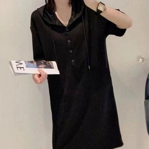 ASURE 여성 여름 솔리드 빅 사이즈 반팔 후드 원피스 반팔 미디 스커트