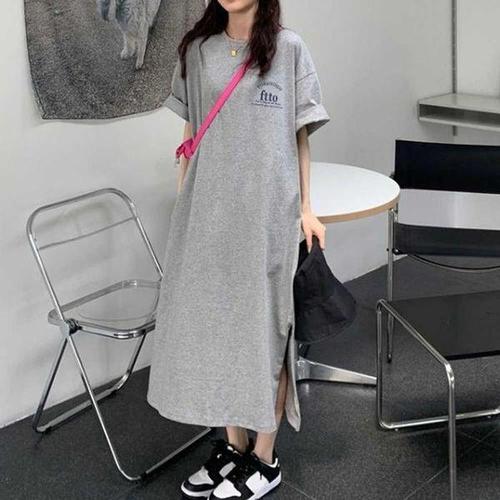 [셀러허브_여성트랜드패션]ONM 레터링 롤업 반팔 트임 롱원피스 데일리 루즈핏