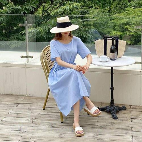 여름 라운드넥 반팔 여성 롱원피스 허리끈 휴양 WFKOIKV