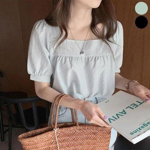 [셀러허브_여성트랜드패션]여자 잔체크 퍼프 스퀘어넥 반팔 블라우스 여름