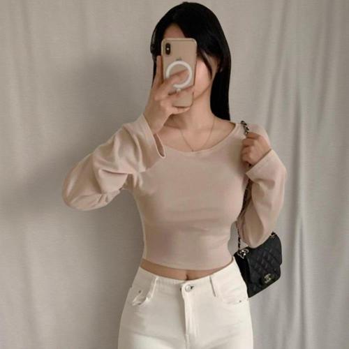 [옷자락]여자 크롭 배꼽티 무지 슬림핏 오프숄더 가을 티셔츠
