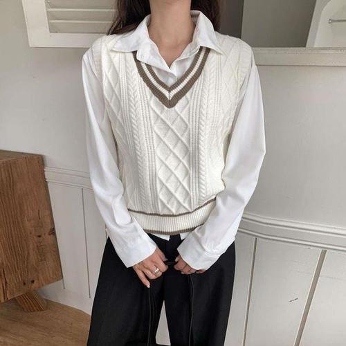 [미미야]라후느 배색 꽈배기 니트 조끼 셔츠 세트