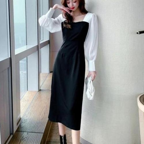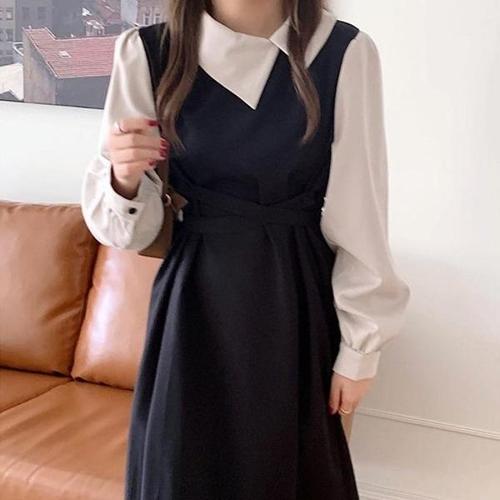 [엄지척]봄 가을 우아한 드레스 긴팔 소매 배색 블랙 롱원피스_19871480_667501