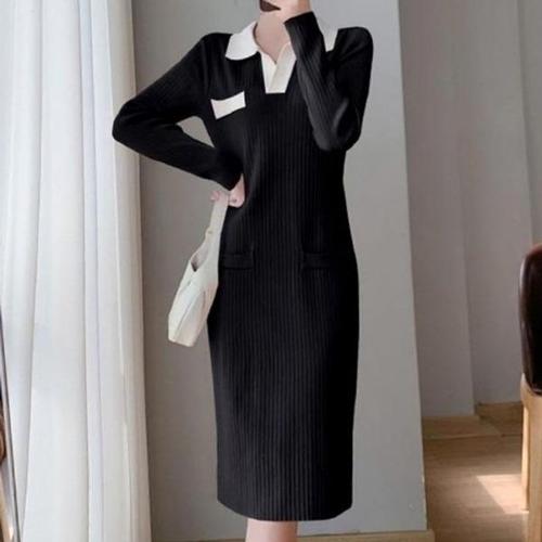 [엄지척]화이트 카라 배색 니트 롱원피스 세로 라인 원피스_19871497_667501