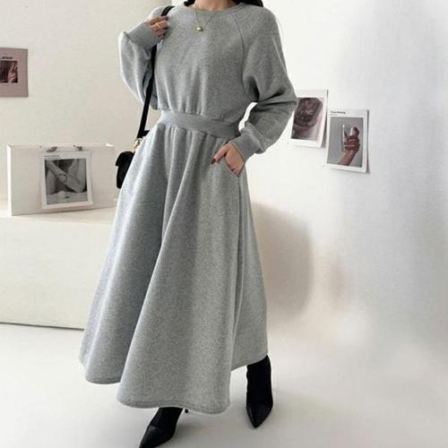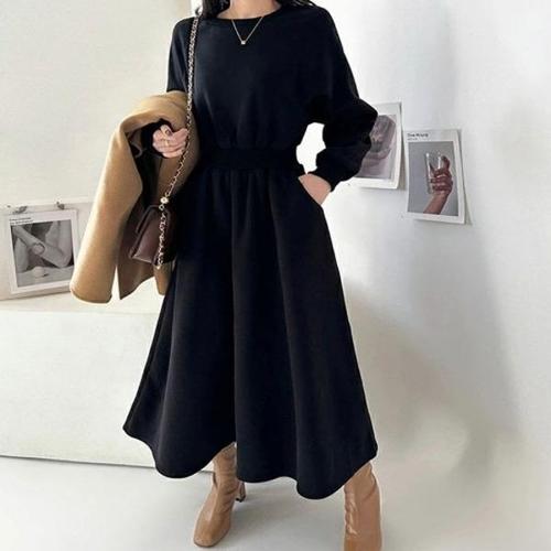 라라티나 여성용 벨미 라운드넥 허리밴딩 긴팔 롱 원피스