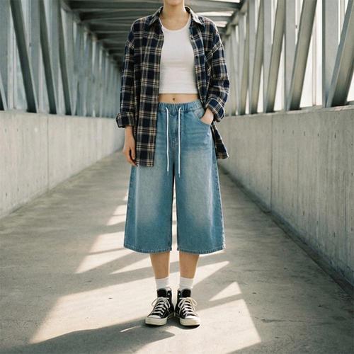 [셀럽하우스]롤업 QXWI4124 허리밴딩 바스락반바지 청반바지 하이웨스트 쮸