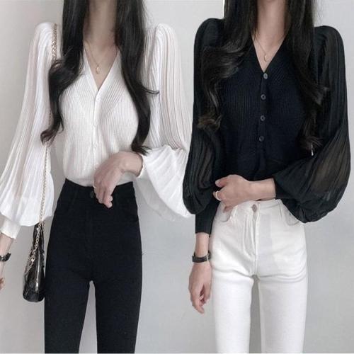 [엄지척]여성 퍼프 브이넥 소매 가디건 벌룬 블라우스 플리츠_19806960_667501
