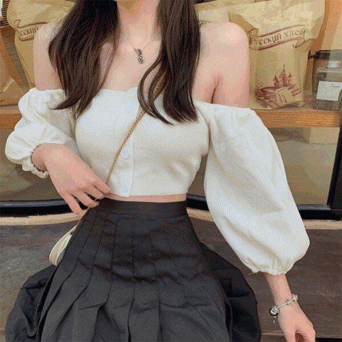 여성 벌룬 반소매 스퀘어넥 골지 숄더 니트웨어