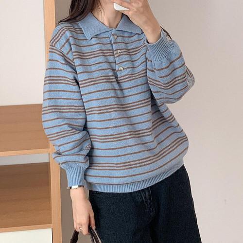 [다잇템]여자 박시핏 벌룬 카라넥 줄무늬 가을옷 니트