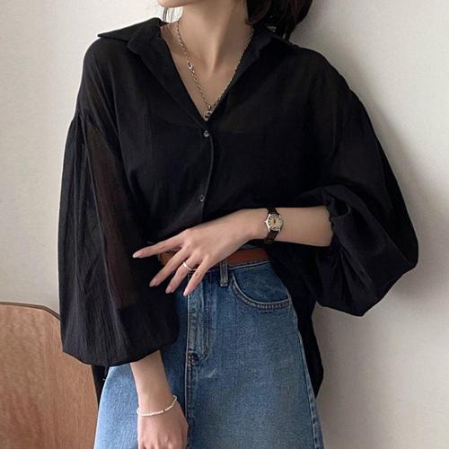 COSYEVNO 여성 남방 가을 빅사이즈 빈티지 심플 루즈핏 트렌디 편한 캐주얼 미디 벌룬 소매 상의 CXJcs-40